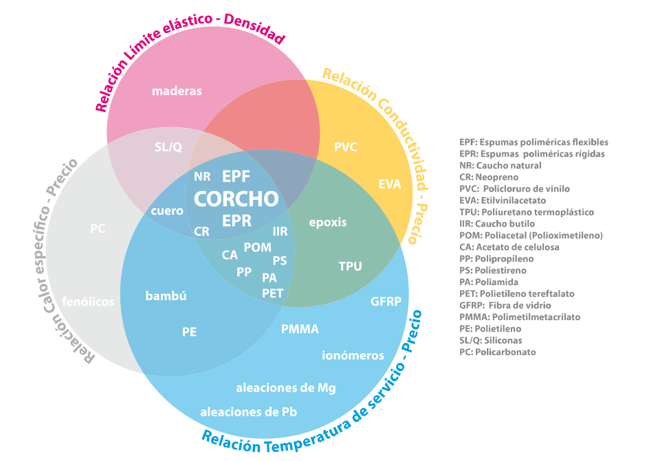 Para investigar las potenciales aplicaciones que puede tener el corcho, se deben conocer sus propiedades técnicas y concretar sus posibles usos. Con este propósito se llevó a cabo un análisis comparativo de las propiedades físicas del corcho con respecto a otros materiales, resultando el siguiente gráfico de tipo Ashby: