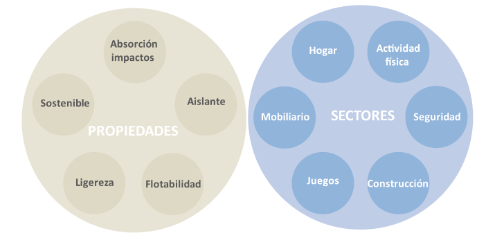 Para identificar los mercados donde el corcho puede tener un mayor potencial de desarrollo en función de sus propiedades, se ha tenido en cuenta aquellos sectores donde los materiales identificados anteriormente (EPF, EPR, NR, CR) tiene sus nichos de mercado más importantes, así como aquellos donde el corcho tiene una presencia testimonial con posibilidades de aumentar.