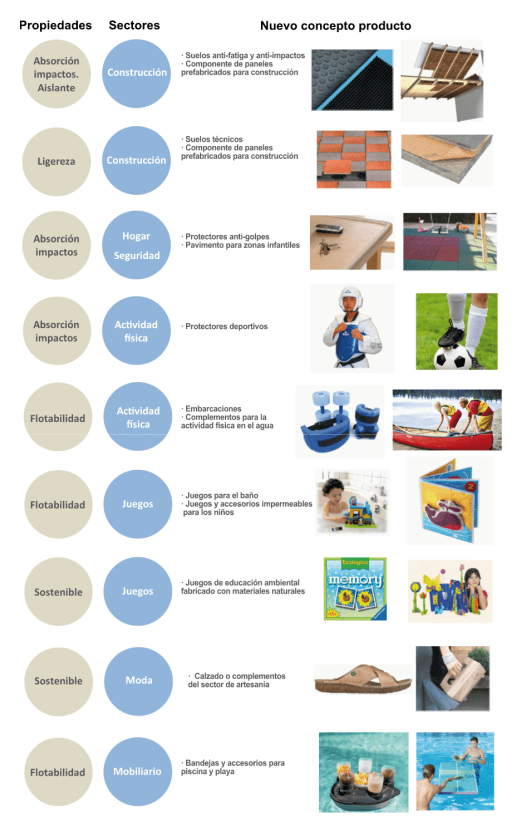 Finalmente, tras identificar los mercados potenciales, se ha realizado un análisis relacionando las características propias del corcho y las necesidades requeridas por cada uno de los ámbitos de utilización, resultando la siguiente tabla donde se muestran posibles nuevos conceptos de producto en corcho según una asociación de parámetros “propiedad-sector”: