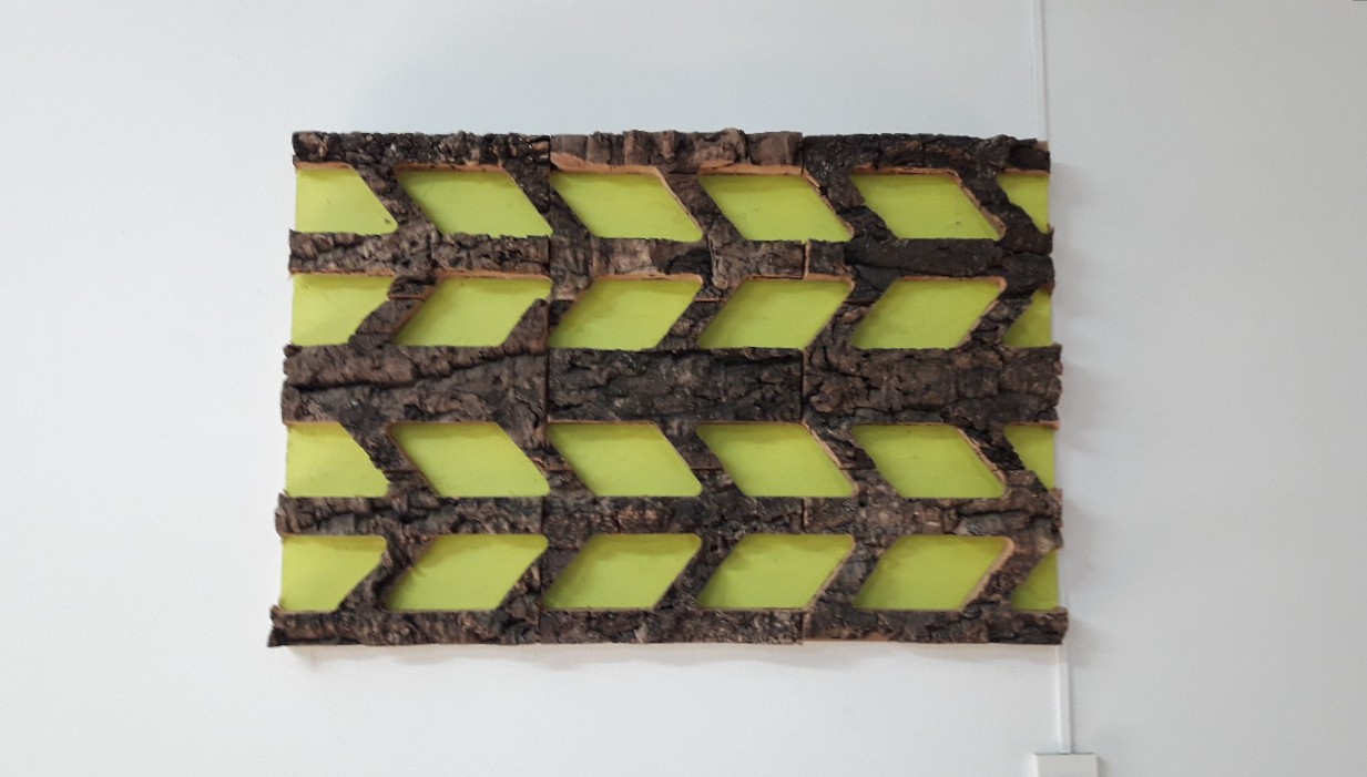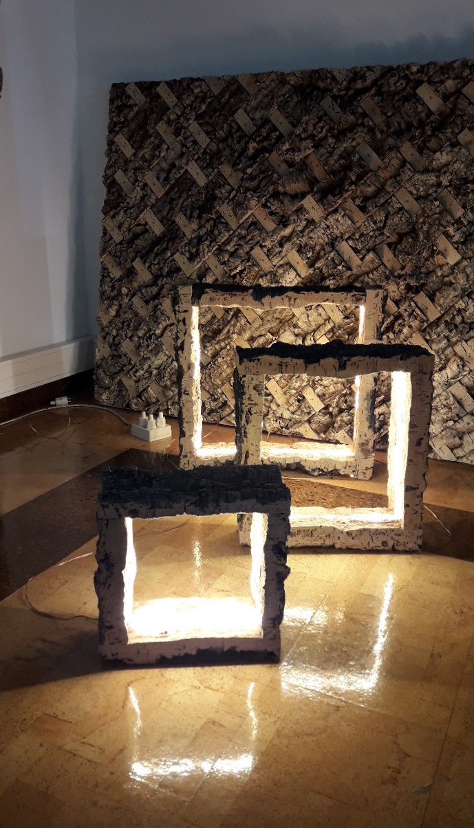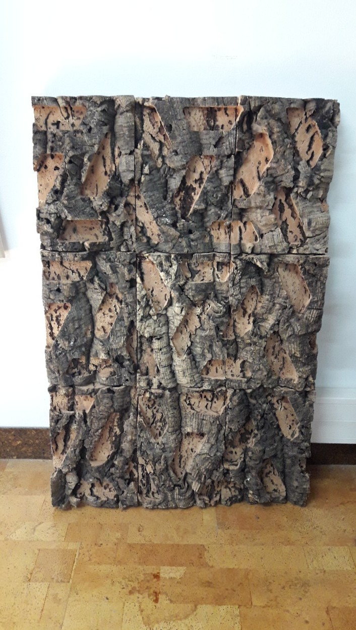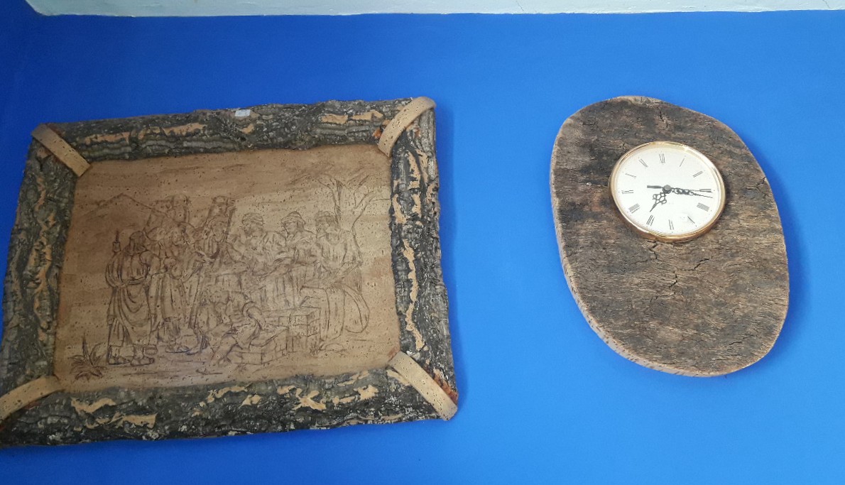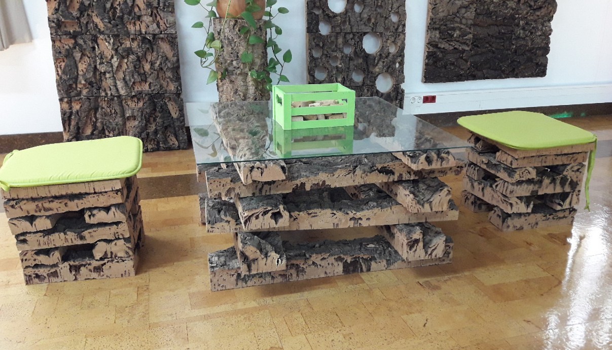 Además del trabajo de Luís, el CICYTEX también alberga un pequeño espacio con una muestra de objetos antiguos, y de otros que no lo son tanto. Entre estos últimos destacan los revestimientos para fachadas y el mobiliario confeccionado con bornizo (corcho de la primera saca).
