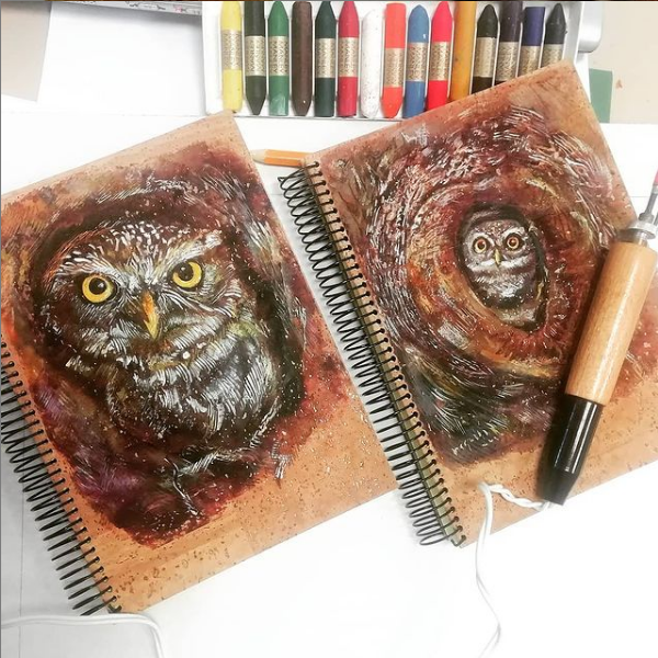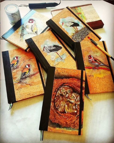 Luís es un ilustrador que realiza sus obras sobre el papel de corcho que adquiere de la industria catalana, empleando para ello diferentes pinturas y esmaltes, así como una pequeña pirograbadora que le acompaña desde sus inicios. Sus creaciones, que han llegado a ser expuestas en la Feria Internacional de Turismo (FITUR), las vende directamente entre las personas de su entorno próximo, gracias al boca-oreja. Aquí podéis disfrutar de una muestra de su arte.