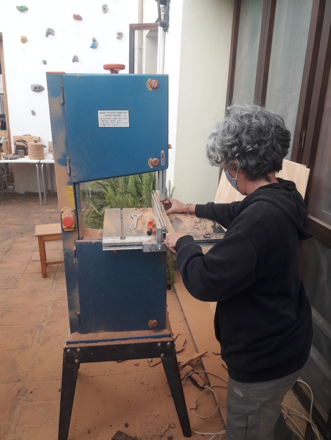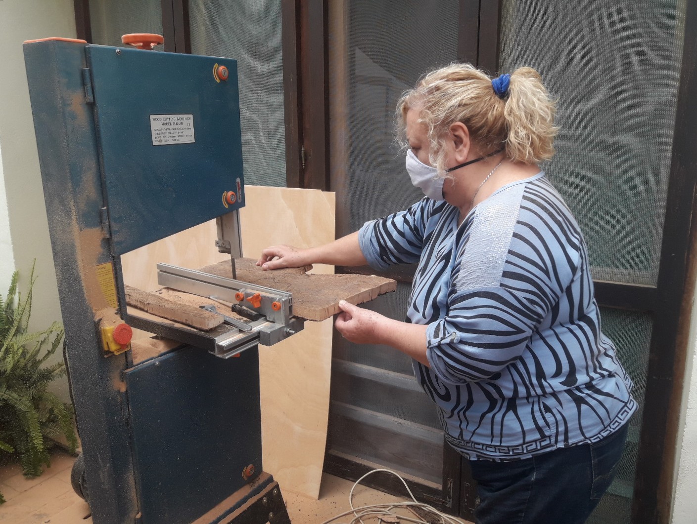 También aprendimos a manejar una máquina imprescindible para trabajar a la escala en la que lo hace Miguel: la sierra de cinta. Con este equipo y algo de destreza es posible rebanar las panas de corcho y separar fácilmente espalda y barriga, obteniendo lo que llamamos “alma” o parte más noble de corcho. El alma a su vez se puede dividir en dos o más partes, dependiendo del calibre y la calidad de la pana. De esta forma tan sencilla nos ahorramos la ardua tarea de lijar con la escofina, disponiendo a su vez de material extra -finas láminas fruto del recorte de espalda y barriga-para emplear en la manufactura de nuestras artesanías.
